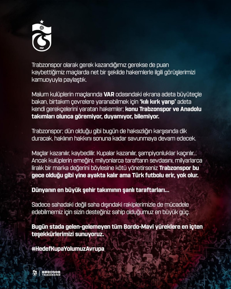 Trabzonspor olarak gerek kazandığımız gerekse de puan kaybettiğimiz maçlarda net bir şekilde hakemlerle ilgili görüşlerimizi kamuoyuyla paylaştık.