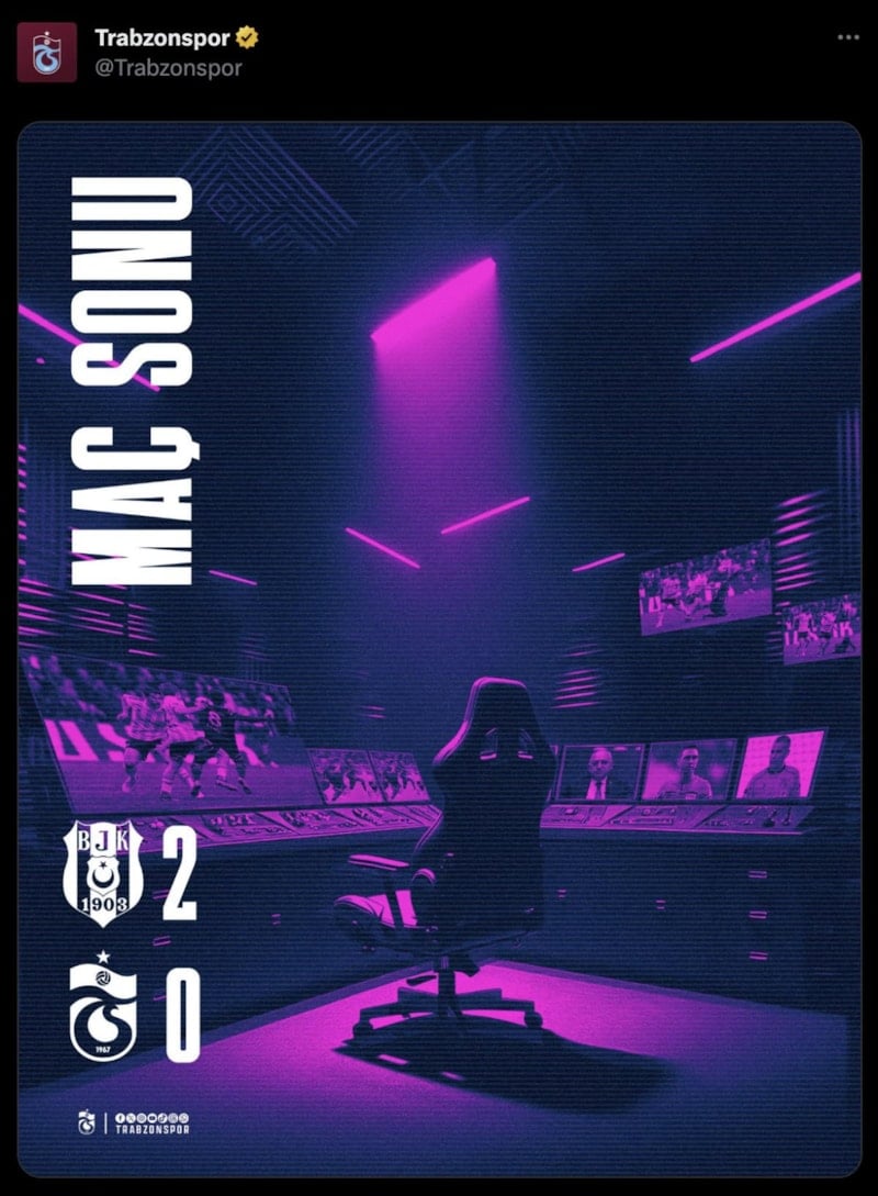 Trabzonspor, Beşiktaş'a 2-0 mağlup olduğu maçın ardından olay bir paylaşıma imza attı. Bordo-mavililer, VAR odasının bulunduğu bir kareyi sosyal medya hesabından paylaştı. Bordo-mavili kulüp daha sonrasında ise hakem kararları hakkında açıklama yayınladı.