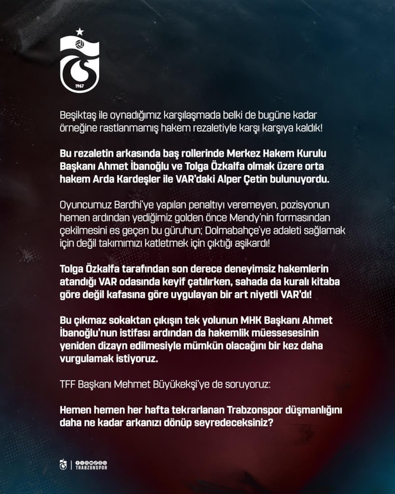 Trabzonspor, ayrıca maçın ardından hakem kararlarıyla ilgili de açıklama yaptı.