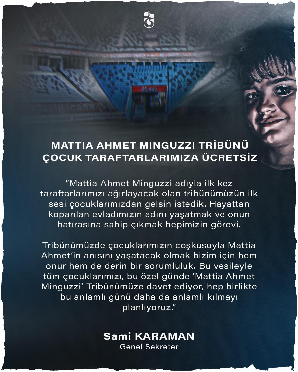 Mattia Ahmet Minguzzi adıyla ilk kez taraftarlarımızı ağırlayacak olan tribünümüzün ilk sesi çocuklarımızdan gelsin istedik. Hayattan koparılan evladımızın adını yaşatmak ve onun hatırasına sahip çıkmak hepimizin görevi. Tribünümüzde çocuklarımızın coşkusuyla Mattia Ahmet’in anısını yaşatacak olmak bizim için hem onur hem de derin bir sorumluluk. Bu vesileyle tüm çocuklarımızı, bu özel günde ‘Mattia Ahmet Minguzzi’ Tribünümüze davet ediyor, hep birlikte bu anlamlı günü daha da anlamlı kılmayı planlıyoruz.
