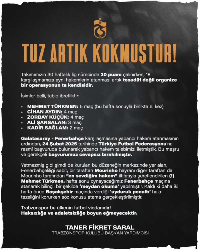 "Mehmet Türkmen 5 maç (bu hafta sonuyla birlikte 6. kez), Cihan Aydın 4 maç, Zorbay Küçük 4 maç, Ali Şansalan 3 maç, Kadir Sağlam 2 maç. Galatasaray-Fenerbahçe karşılaşmasına yabancı hakem atanmasının ardından, 24 Şubat 2025 tarihinde Türkiye Futbol Federasyonuna resmi başvuruda bulunarak yabancı hakem talebimizi iletmiştik. Bu meşru ve gerekçeli başvurumuz cevapsız bırakılmıştır. Yetmezmiş gibi şimdi de kurulan bu düzeneğin merkezinde yer alan, Fenerbahçeliliği sabit, bir taraftan Mourinho hayranı diğer taraftan da Mourinho tarafından 'en sevdiğim hakem' iltifatıyla şereflendirilen Mehmet Türkmen, hafta sonu oynayacağımız Fenerbahçe maçına atanarak bilinçli bir şekilde meydan okuma yapılmıştır. Kaldı ki daha iki hafta önce Başakşehir maçında verdiği uyduruk penaltı hala tazeliğini korurken söz konusu atama gerçekleştirilmiştir. Trabzonspor bu ülkenin futbol vicdanıdır. Haksızlığa ve adaletsizliğe asla boyun eğmeyecektir."