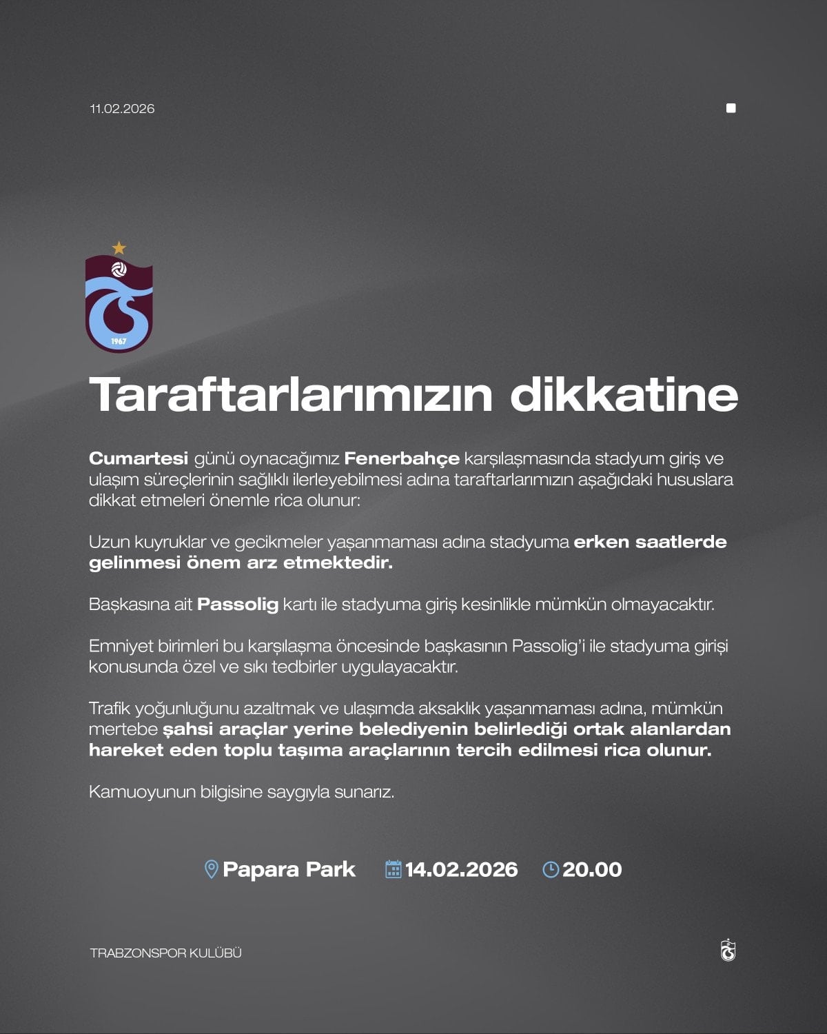 - Trabzonspor, Fenerbahçe maçı öncesi taraftarlarına stadyuma giriş ve ulaşım süreçlerinin önemini vurguladı.