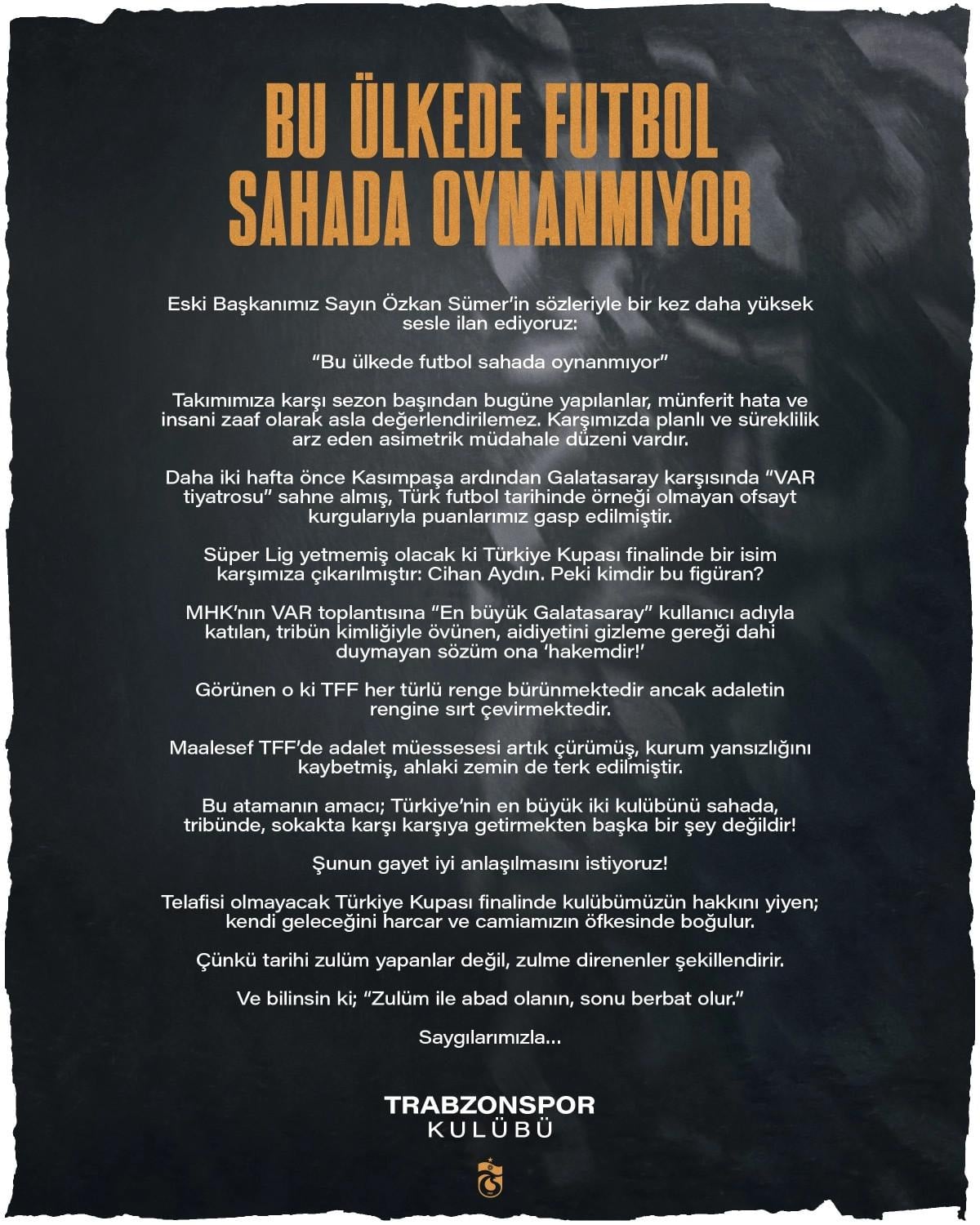 Trabzonspor'dan yapılan açıklamada, "Bu ülkede futbol sahada oynanmıyor. Zulüm ile abad olanın, sonu berbat olur." denildi.