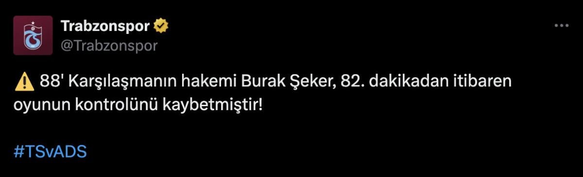 Trabzonspor yaptığı paylaşımda, "88' Karşılaşmanın hakemi Burak Şeker, 82. dakikadan itibaren oyunun kontrolünü kaybetmiştir!" ifadelerini kullanıldı.