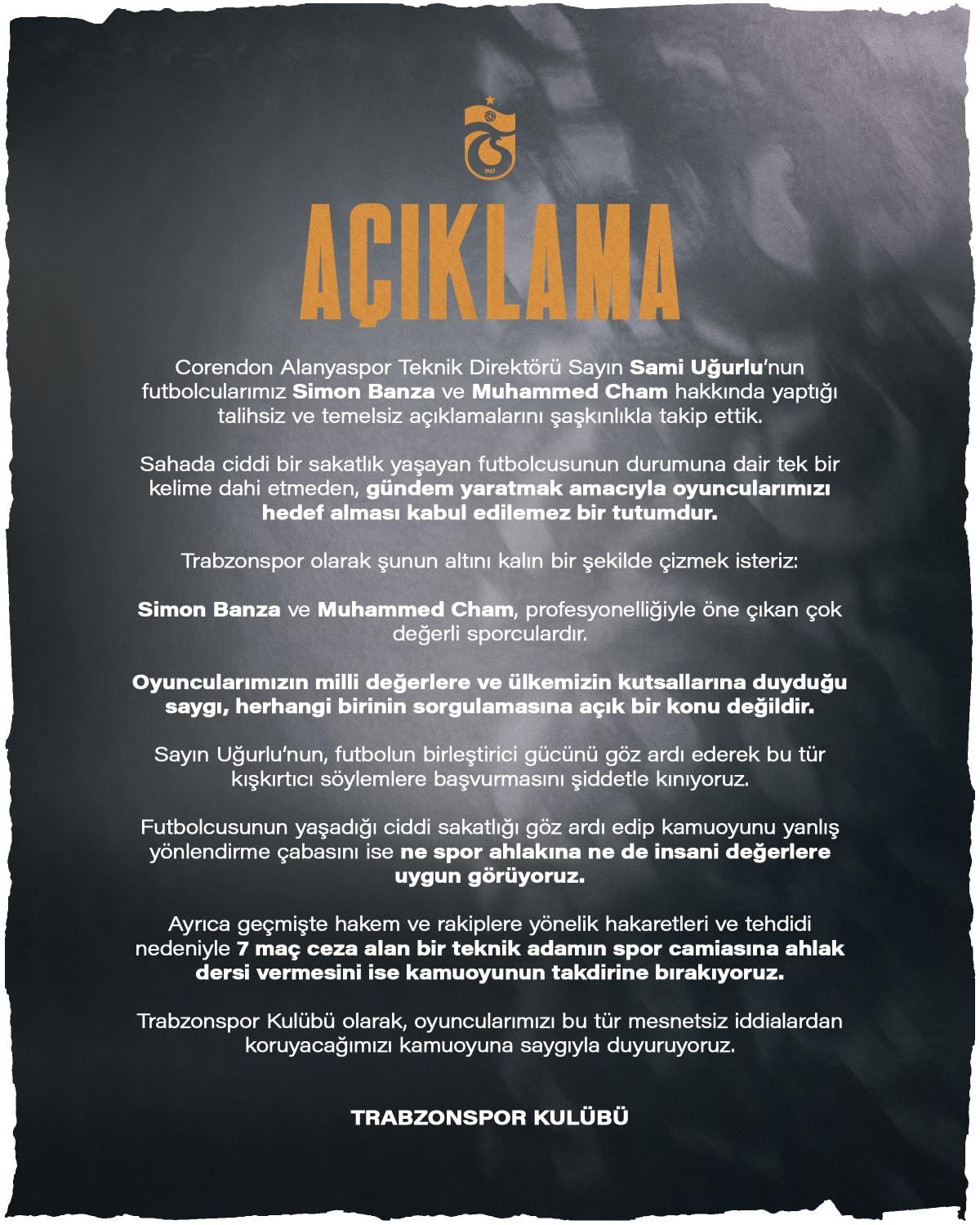 Corendon Alanyaspor Teknik Direktörü Sayın Sami Uğurlu'nun futbolcularımız Simon Banza ve Muhammed Cham hakkında yaptığı talihsiz ve temelsiz açıklamalarını şaşkınlıkla takip ettik.