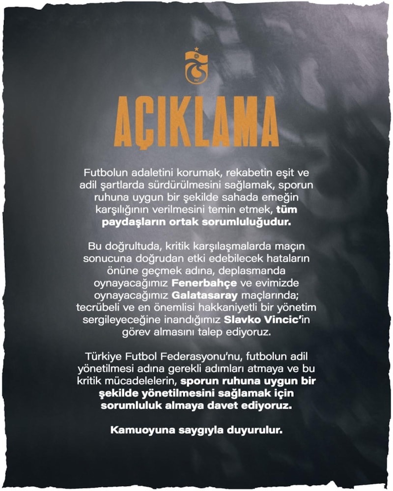 Bu doğrultuda, kritik karşılaşmalarda maçın sonucuna doğrudan etki edebilecek hataların önüne geçmek adına, deplasmanda oynayacağımız Fenerbahçe ve evimizde oynayacağımız Galatasaray maçlarında; tecrübeli ve en önemlisi hakkaniyetli bir yönetim sergileyeceğine inandığımız Slavko Vincic'in görev almasını talep ediyoruz.