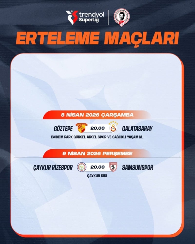 Öte yandan bir başka erteleme maçında Çaykur Rizespor ile Samsunspor 9 Nisan Perşembe günü saat 20.00'de karşı karşıya gelecek.