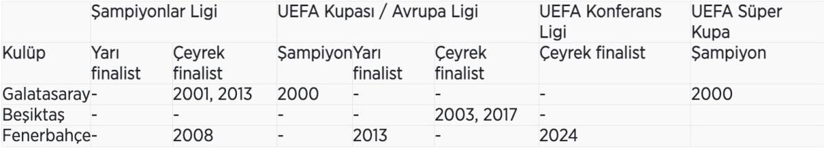 Fenerbahçe, 2013 yılında UEFA Avrupa Ligi'ne yarı finalde veda ederek kupaya en çok yaklaşan ekip olurken, Beşiktaş ise 2003 ve 2017 yıllarında aynı organizasyonda çeyrek final maçlarına çıktı.