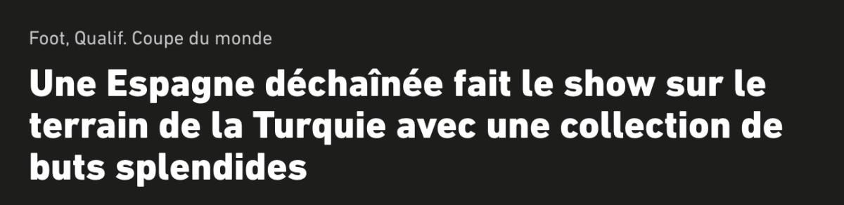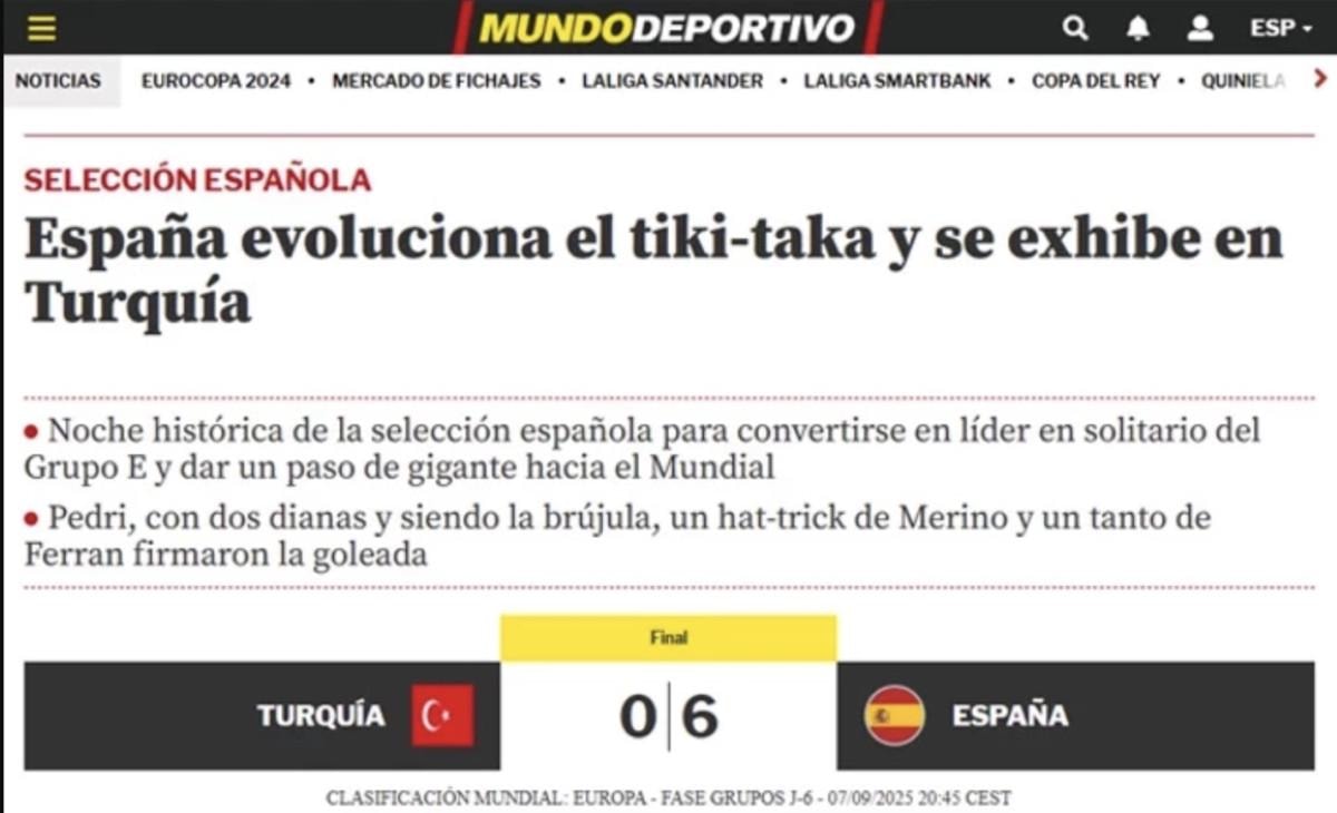 "İspanya'nın Türkiye'de yıkıcı senfonisi. İspanya, Dünya Kupası yolunda en zorlu rakibini Pedri'nin iki golü ve Mikel Merino'nun üç golüyle ezip geçti."