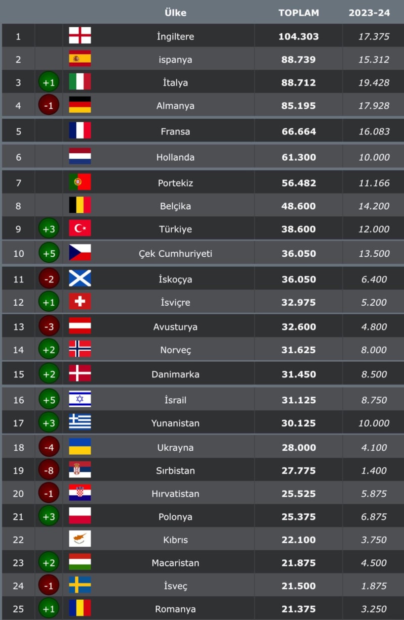 İşte UEFA ülke puanı sıralamasında son durum: