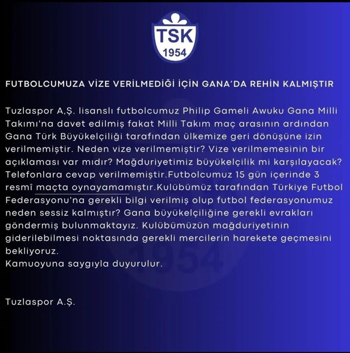 Gana Milli Takımı'na davet edilen ancak milli maç sonrası Türkiye'ye dönemeyen Philip Gameli Awuku'yla ilgili Tuzlaspor'dan açıklama geldi.