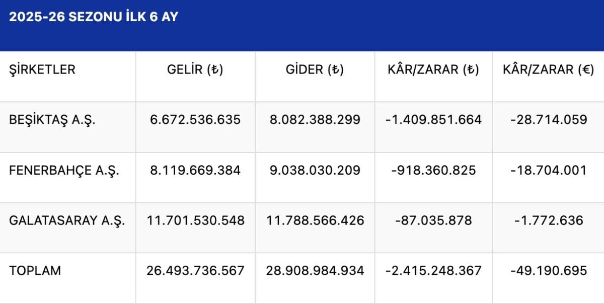 - Beşiktaş, Fenerbahçe ve Galatasaray kulüpleri, 2025-26 sezonunun ilk yarısında toplam 2 milyar 415 milyon lira zarar etti.