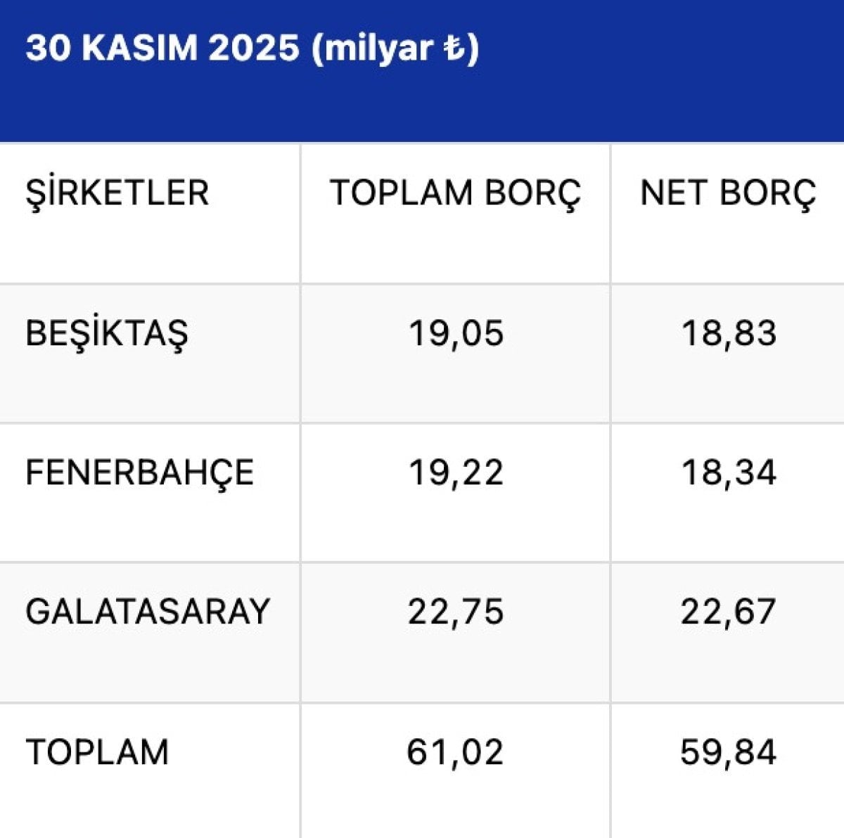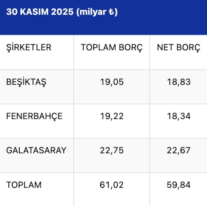 Buna göre Galatasaray’ın 22,67 milyar lira, Beşiktaş’ın 18,83 milyar lira ve Fenerbahçe’nin 18,34 milyar lira olmak üzere 3 kulübün toplam 59,84 milyar liralık (1,22 milyar euro) net borcu bulunuyor.