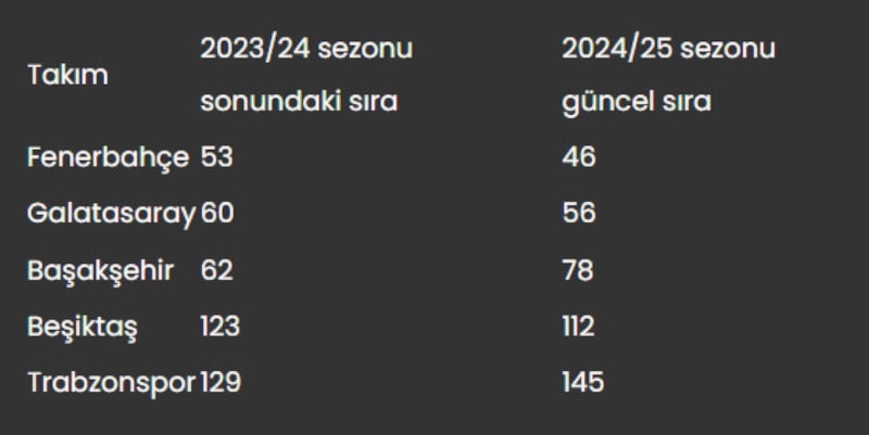 Aynı dönemde Başakşehir 62. sıradan 78. sıraya düşerken, Beşiktaş ise 123. sıradan 112. sıraya yükseldi. Trabzonspor ise sezon başında bulunduğu 129. sıradan 145. sıraya geriledi.