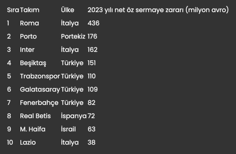 Geçen yıl en fazla net öz sermaye zararı olan Türk takımı Beşiktaş, 151 milyon euro eksiyle ilk 10'da 4. sırada yer alırken, Trabzonspor, 110 milyon euro zararla 5. sırada, Galatasaray, 109 milyon euro zararla 6. sırada, Fenerbahçe ise 82 milyon euro zararla 7. sırada gösterildi.