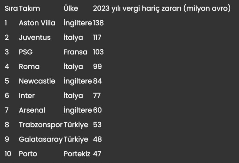 Geride kalan sene Avrupa'da en fazla zarar açıklayan ilk 10 takım arasında 2 Türk takımı dışında, 3'er İngiliz ve İtalyan, birer de Portekiz ile Fransız ekibi bulunuyor.