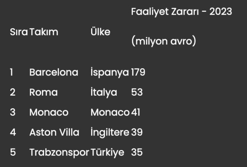 Listede, Roma, 53 milyon euro, Monaco, 41 milyon euro ve Aston Villa ise 39 milyon euro faaliyet zararıyla ilk 5'te yer alan diğer takımlar oldu.