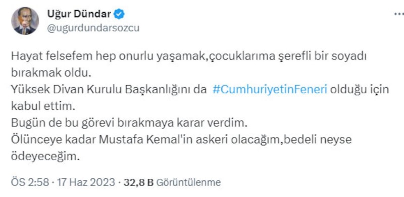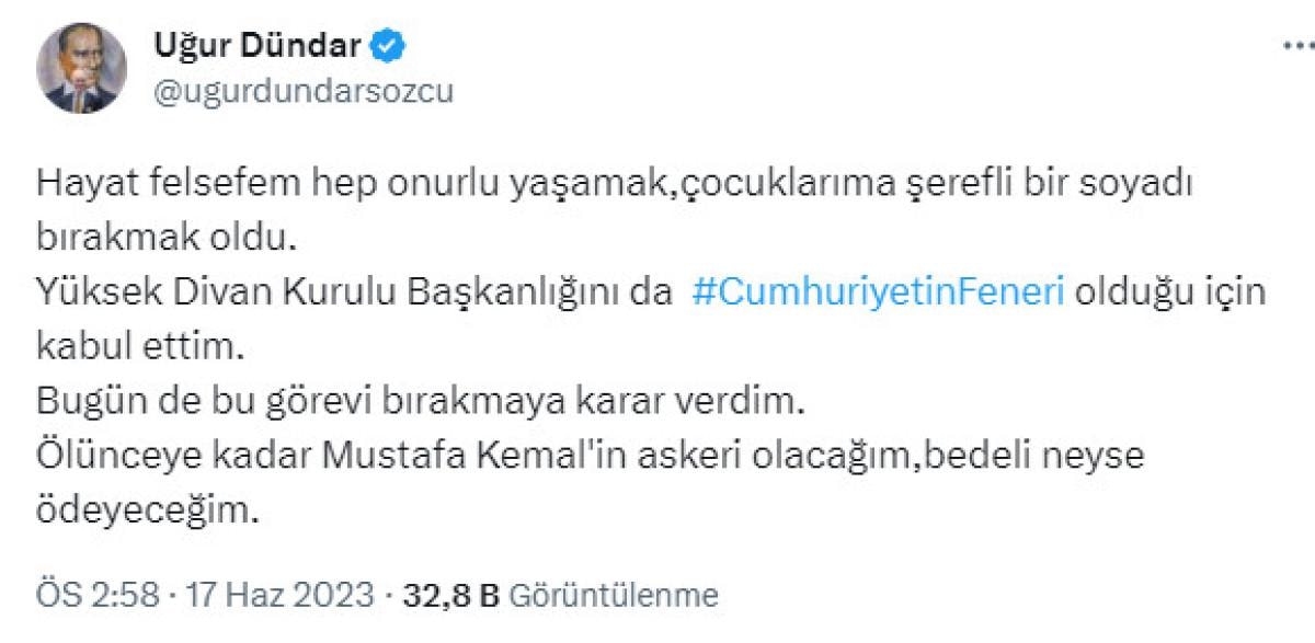 Uğur Dündar canlı yayınlanan kongrede açıklama yapmak yerine yerine şu tweet'le görevi bıraktığını duyurdu: