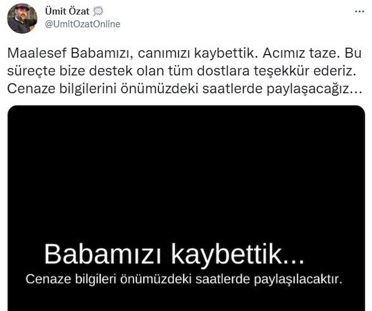 "Maalesef Babamızı, canımızı kaybettik. Acımız taze. Bu süreçte bize destek olan tüm dostlara teşekkür ederiz. Cenaze bilgilerini önümüzdeki saatlerde paylaşacağız."