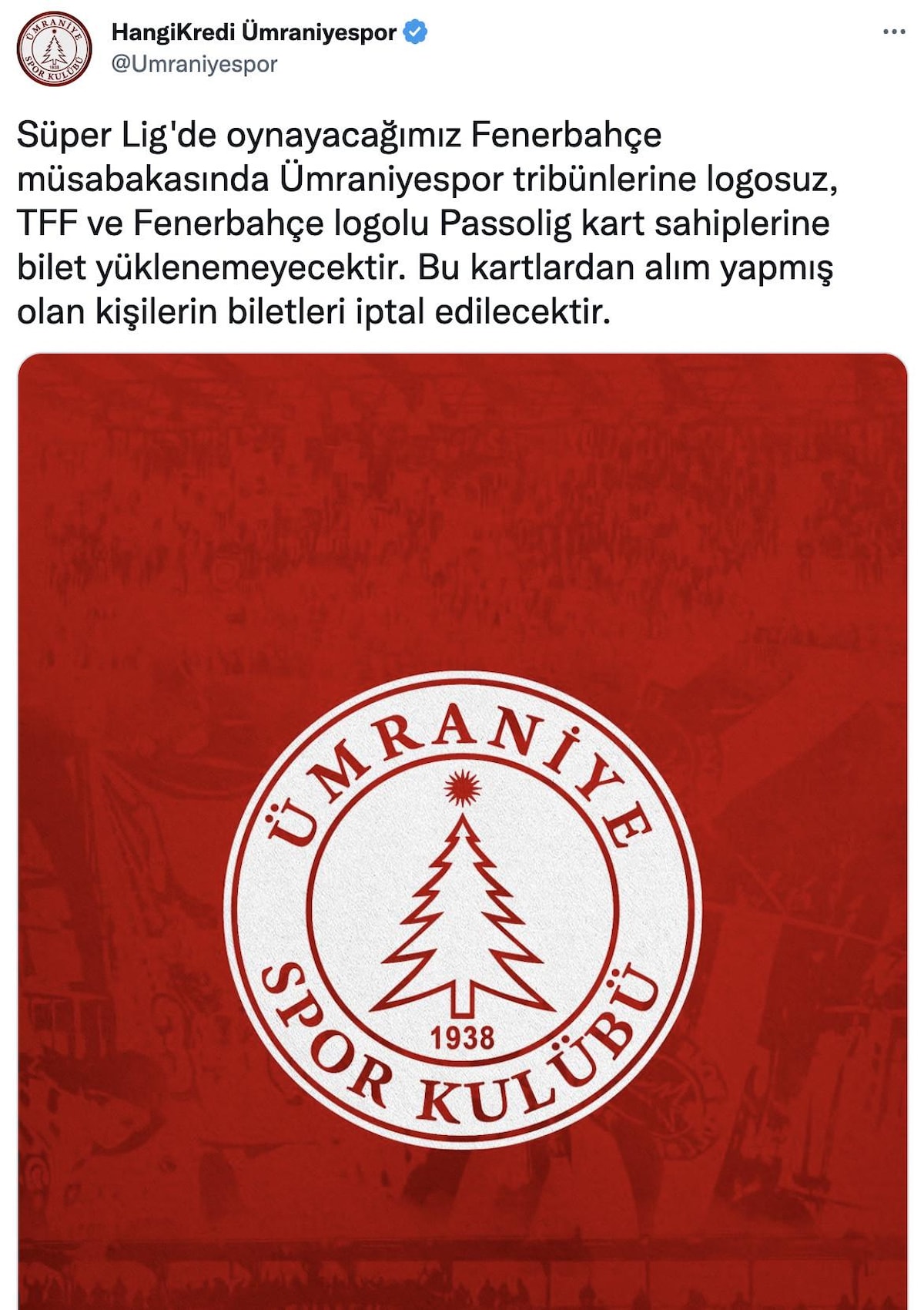 "Süper Lig'de oynayacağımız Fenerbahçe müsabakasında Ümraniyespor tribünlerine logosuz, TFF ve Fenerbahçe logolu Passolig kart sahiplerine bilet yüklenemeyecektir. Bu kartlardan alım yapmış olan kişilerin biletleri iptal edilecektir."
