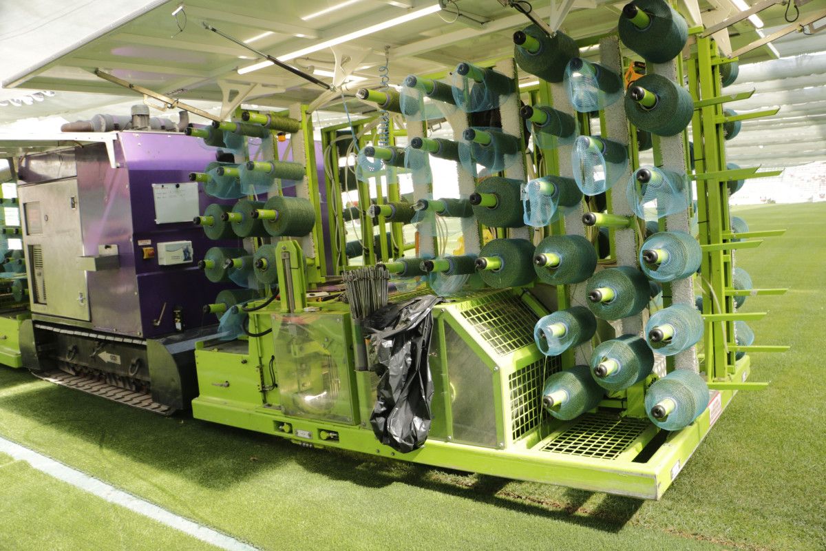Ama işi garantiye alma adına bu çimle ittifak etmedik ve hibrit çim de bunun içerisinde katmak suretiyle daha güçlü bir zemin ortaya çıkıyor. İşte şu ana kadar hibrit çim hariç geri kalan kısmı tamamlandı. Hiçrit çim de bir hafta süreyle çalışacak, bir hafta, 10 gün sonra burası bütünüyle tamamlanmış olacak. Zemin olarak Türkiye'nin en iyi sahalarından birisi haline gelmiş olacak. Bir taraftan da arkadaşlar, koltuk vs. gibi kırılan dökülenleri de tamir ediyorlar. Bütün bunlar sezonun ilk haftasına çok rahatlıkla yetişecek gibi duruyor