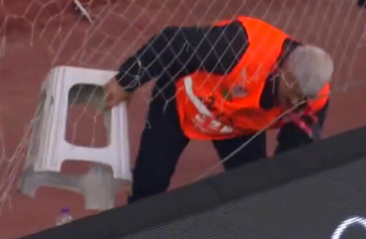 Antalyasporlu Mike van de Streek'in sert şutu saha kenarında oturan stat görevlisinin taburesine isabet edince tabure kırıldı, görevli kendini yerde buldu.