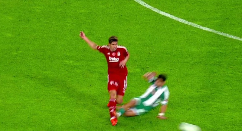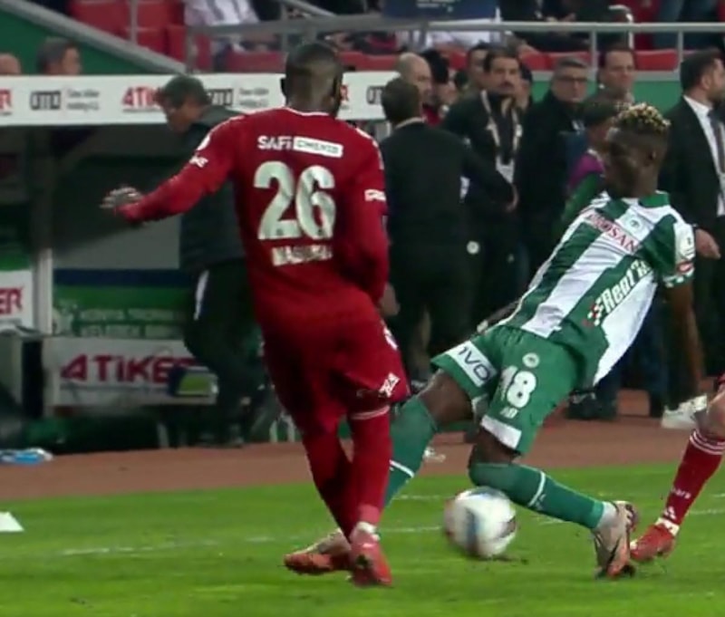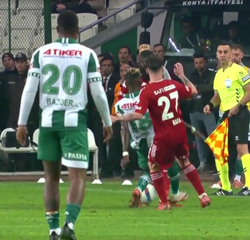 Konyaspor'da Melih Bostan, Gabriel Paulista'ya yaptığı faulün ardından sarı kart gördü. Hakem Ali Şansalan, VAR'dan gelen uyarının ardından pozisyonu ekranda izledi.