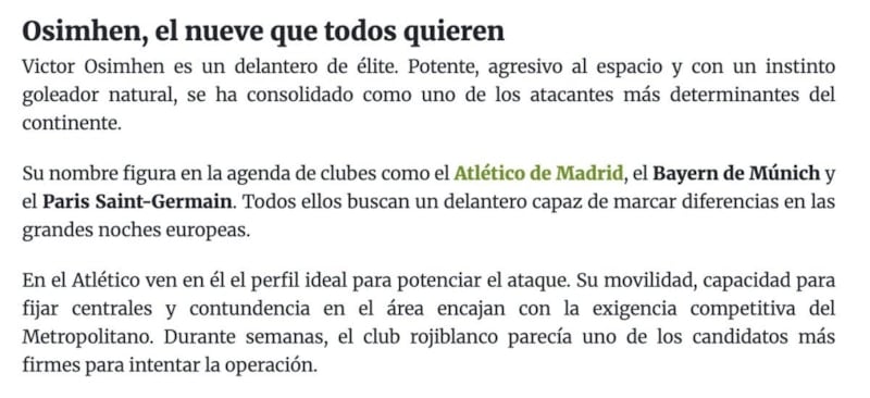 "Victor Osimhen, yaklaşan yaz transfer döneminin kilit isimlerinden biri olmaya aday görünüyor. Performansı ve uluslararası itibarı, onu birçok Avrupa devinin arasında kıyasıya geçmesi beklenen bir transfer yarışının merkezine yerleştirdi."