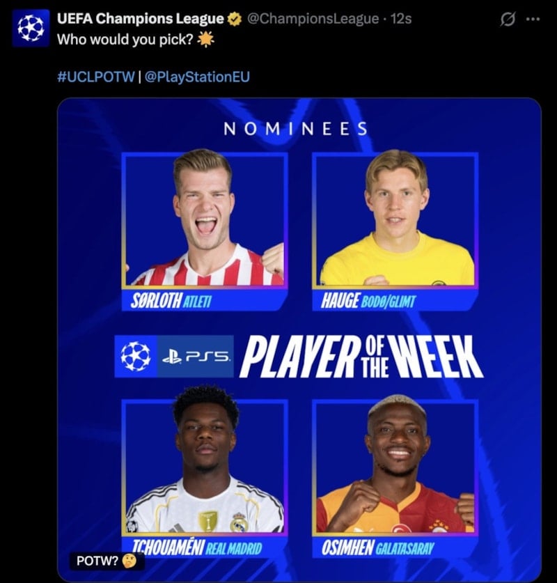 Buna göre Osimhen, UEFA Şampiyonlar Ligi'nde haftanın oyuncusu ödülünün adayları arasında yer aldı.