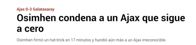 "Amsterdam'da karanlık bir gece ve Victor Osimhen için altın bir gece. Galatasaray, Nijeryalı forvetin Hollanda stadını susturan üç golüyle Johan Cruyff Arena'da Ajax'ı 3-0 mağlup etti. Türk ekibi rakiplerinin hatalarından yararlanarak ve eleme mücadelesinde güçlü bir mesaj vererek açık ara üstünlük sağladı. Ajax ise bitmek bilmeyen bir krize doğru sürüklenmeye devam ediyor."