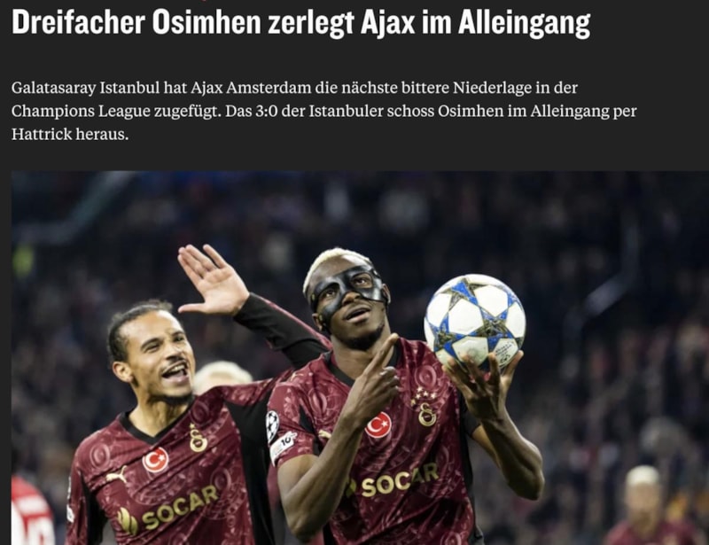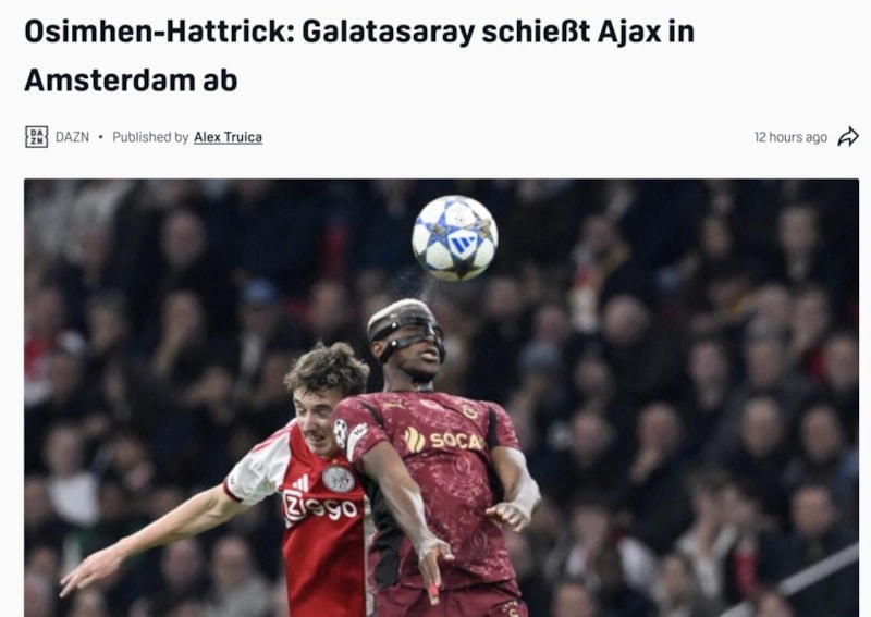 "Son 16 turuna kalmaya çok yaklaşan Galatasaray, Amsterdam'da Ajax'a zor bir ders verdi: önce bir kafa vuruşuyla, ardından iki penaltıyla. Victor Osimhen muhteşem bir hat-trick ile sonucu belirledi."