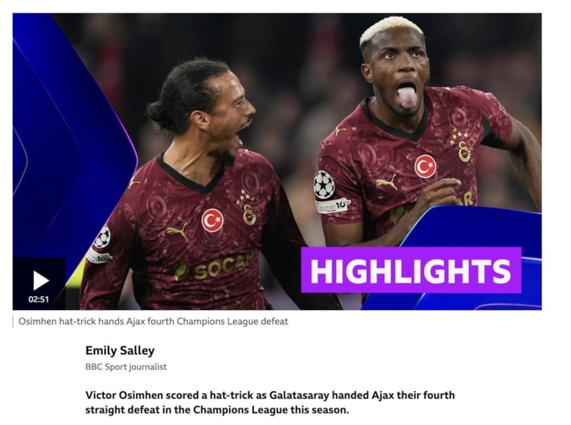 "UEFA Şampiyonlar Ligi'nin 4. haftasında Galatasaray, Amsterdam'daki Johan Cruyff Arena'da hayal kırıklığı yaratan Ajax'ı 3-0 yenerek rahat bir galibiyet aldı. Victor Osimhen, Galatasaray adına üç golü de attı; biri muhteşem bir kafa vuruşu ve ikisi penaltıdan."