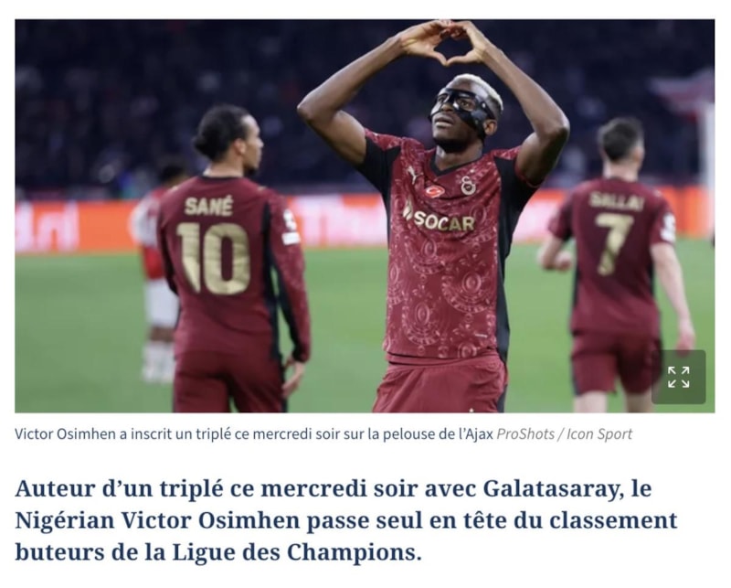 Galatasaray'ın Ajax'ı deplasmanda 3-0 mağlup ettiği karşılaşmaya, "hat-trick" yaparak damgasını vuran Victor Osimhen, Şampiyonlar Ligi gol krallığı yarışında zirveye oturdu ve dış basında manşetleri süsledi.