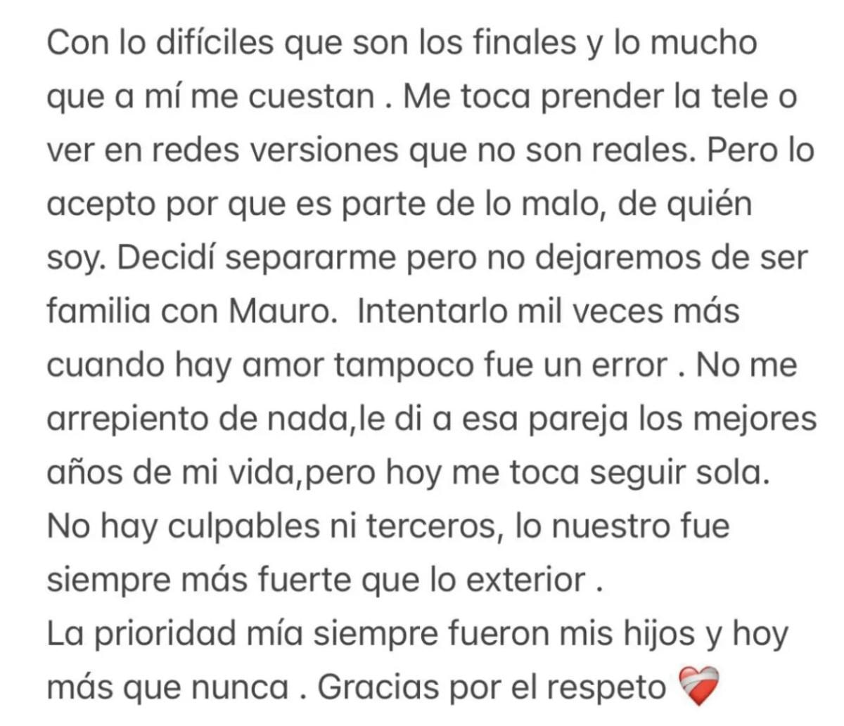 Sonları ne kadar zor olsa da benim için o kadar zor. Televizyonu açmam ya da gerçek olmayan iddiaları izlemem gerekiyor. Ama bunu kabul ediyorum çünkü bu benim sorunumun, kim olduğumun bir parçası. Ayrılmaya karar verdim ama Mauro ile aile olmaktan vazgeçmeyeceğiz. Aşk varken bin kez daha denemek de hata değildi. Hiçbir şeyden pişman değilim, bu ilişkiye hayatımın en güzel yıllarını verdim ama bugün yalnız devam etmek zorundayım. Suçlanacak kimse yok ve üçüncü şahıslar da yok, aramızdaki şey her zaman dışarıdan daha güçlüydü. Önceliğim her zaman çocuklarım oldu ve bugün her zamankinden daha fazla. Saygınız için teşekkür ederim.