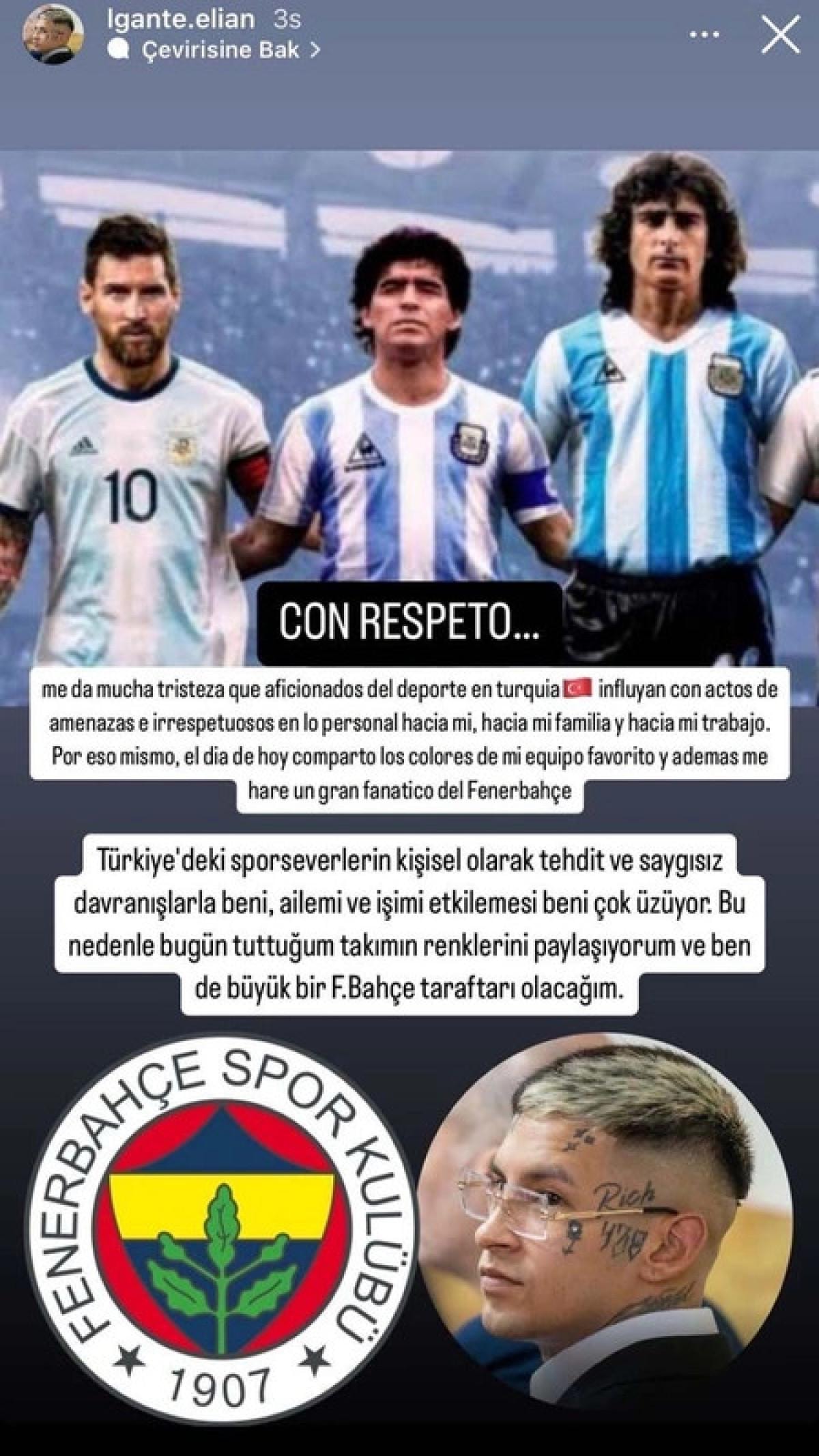 Wanda Nara ile aşk yaşayan rapçi L-Gante’ye Galatasaraylı taraftarlar, sosyal medyadan tepki gösteren paylaşımlar yaptı. Bunun üzerine L-Gante, sosyal medya hesabından yaptığı paylaşımla Fenerbahçe taraftarı olacağını ifade etti.