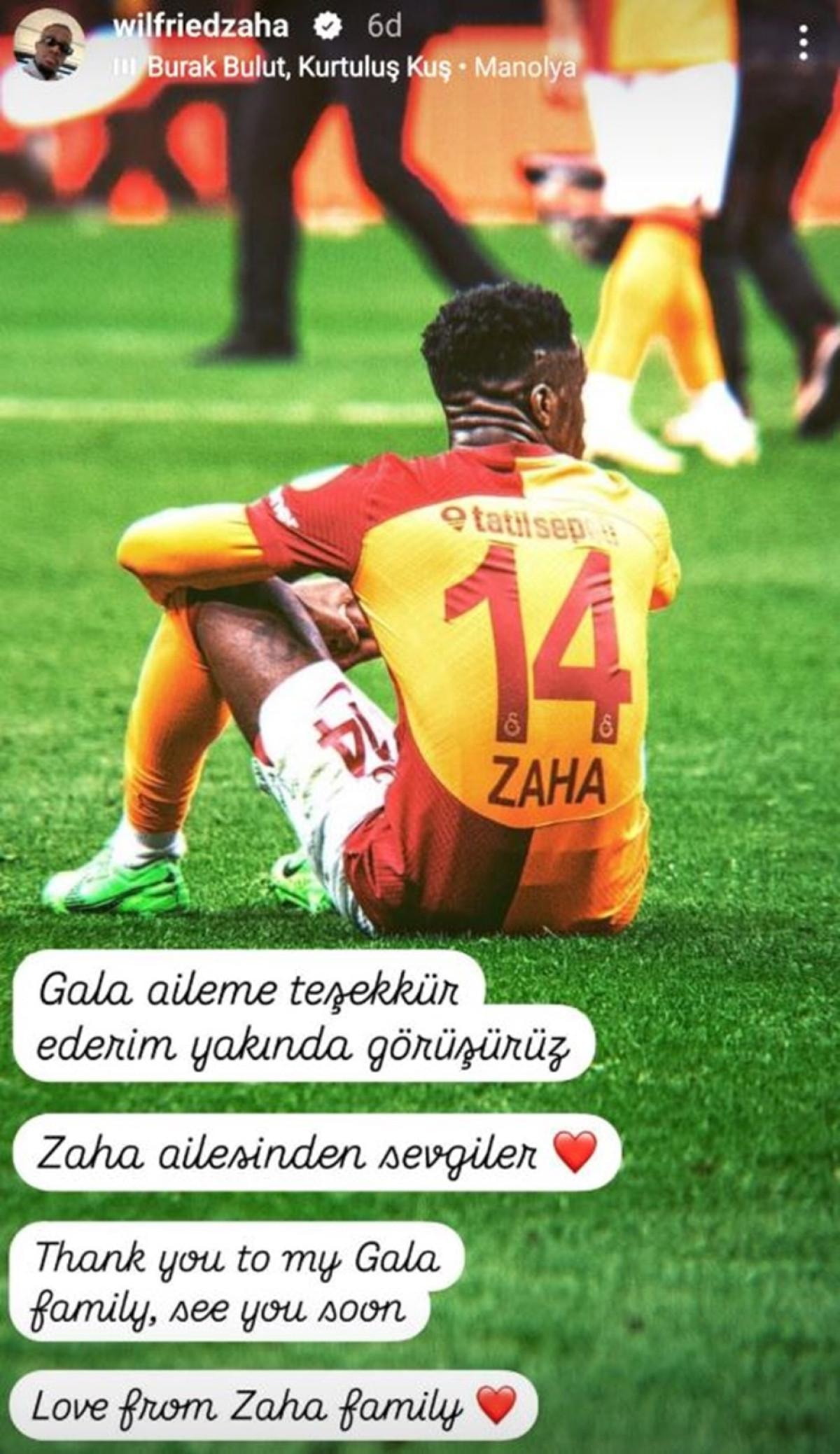Zaha, Galatasaray formalı paylaşımında, "Gala aileme teşekkür ederim yakında görüşürüz. Zaha ailesinden sevgiler." ifadelerine yer verdi.