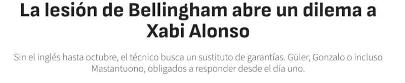 AS'ın derlediği haberde Jude Bellingham'ın yaşadığı sakatlık sonrası sahalardan 12 haftalık bir süre bandında uzak kalacağı ifade edilirken, Xabi Alonso'nun çözüm yollarından birinin Arda Güler'e çıktığı belirtildi.