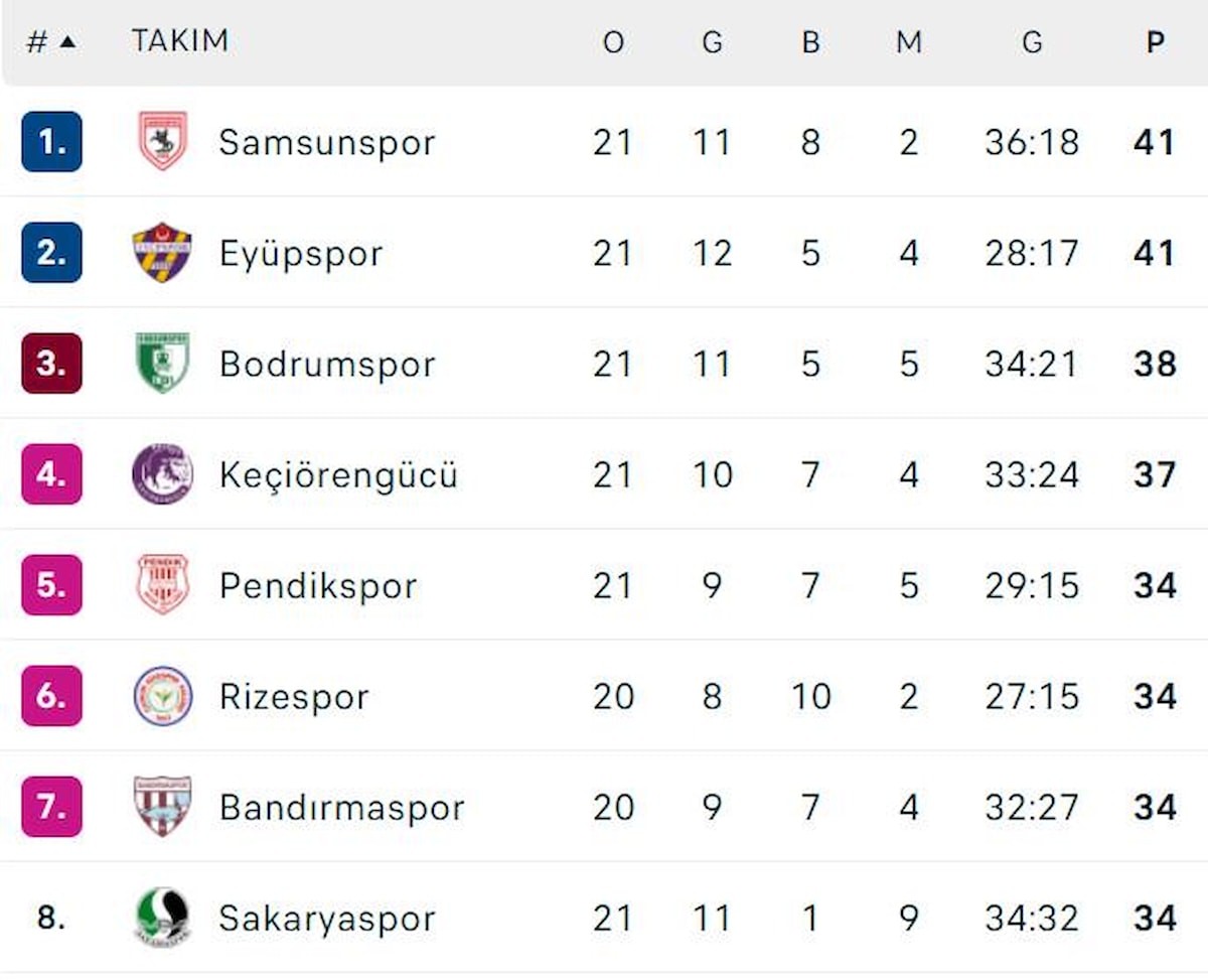 Samsun ekibi, 11 galibiyet, 8 beraberlik ve 2 mağlubiyetle 41 puan toplarken, son 12 haftanın lideri Eyüpspor ise 12 galibiyet, 5 beraberlik, 4 mağlubiyetle yine aynı şekilde 41 puanı hanesine yazdırdı.