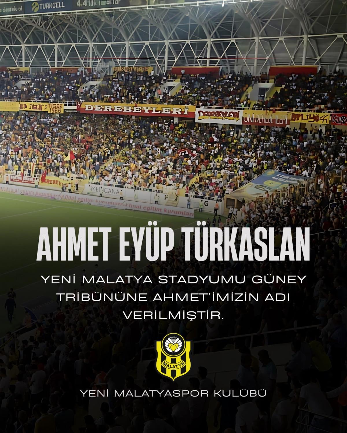 Kulüpten yapılan açıklamaya göre, depremde hayatını kaybeden Türkaslan'ın giydiği 14 numaralı formanın emekli edildiği ve Yeni Malatya Stadyumu Güney Tribünü'nün adının ise "Ahmet Eyüp Türkaslan Tribünü" olarak değiştirildiği belirtildi.