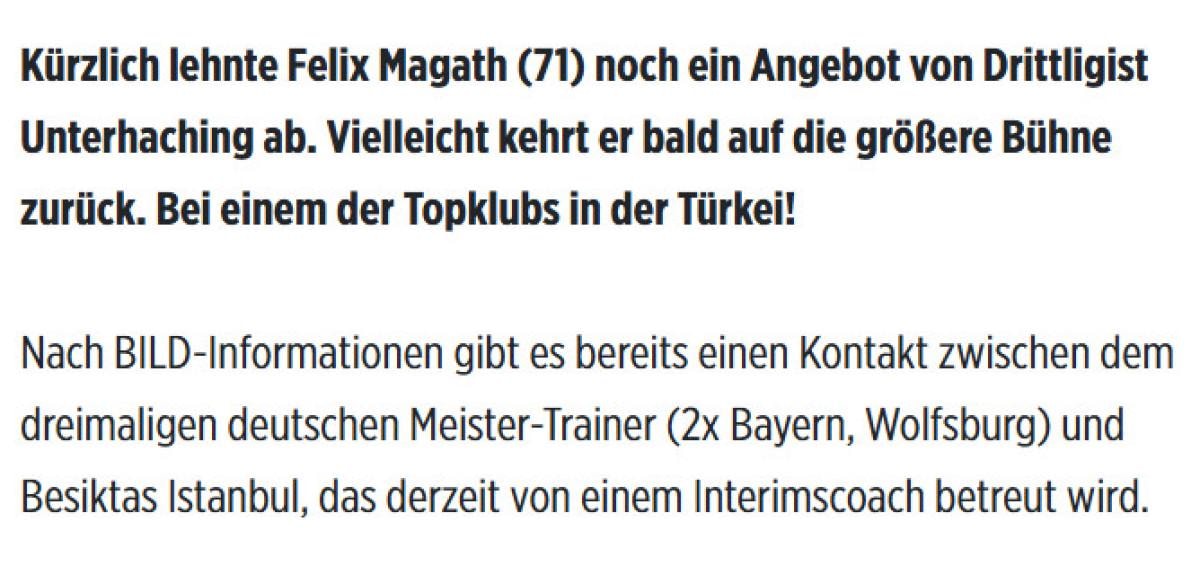 Alman basınından Bild'de yer alan habere göre, Beşiktaş, Felix Magath ile temasa geçti.