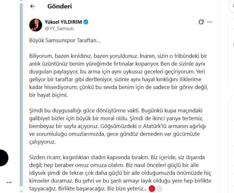Maça gelen taraftar sayısındaki büyük düşüşün ardından taraftara seslenen Başkan Yıldırım, "Büyük Samsunspor taraftarı; biliyorum bazen kırıldınız, bazen yoruldunuz. İnanın, sizin o tribündeki bir anlık üzüntünüz benim yüreğimde fırtınalar koparıyor. Ben de sizinle aynı duyguları paylaşıyor, bu arma için aynı uykusuz geceleri geçiriyorum. Yeri geliyor bir taraftar gibi dertleniyor, sizinle aynı hayal kırıklığını iliklerime kadar hissediyorum; çünkü bu sevda benim için de sadece bir görev değil, bir hayat biçimi. Şimdi bu duygusallığı güce dönüştürme vakti. Dünkü kupa maçındaki galibiyet bizler için büyük bir moral oldu. Şimdi de ikinci yarıya tertemiz, bembeyaz bir sayfa açıyoruz" dedi.