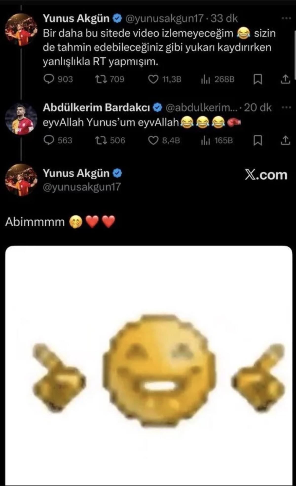 Yunus Akgün, daha sonra "Abimmmm" ve kalp emojileriyle bir paylaşımda bulundu.