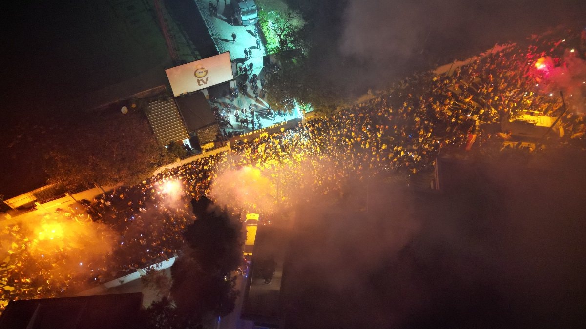 Dronla çekilen görüntülerde, binlerce taraftarın Florya Metin Oktay Tesisleri çevresini doldurduğu ve adeta sarı-kırmızıya boyadığı görüldü.