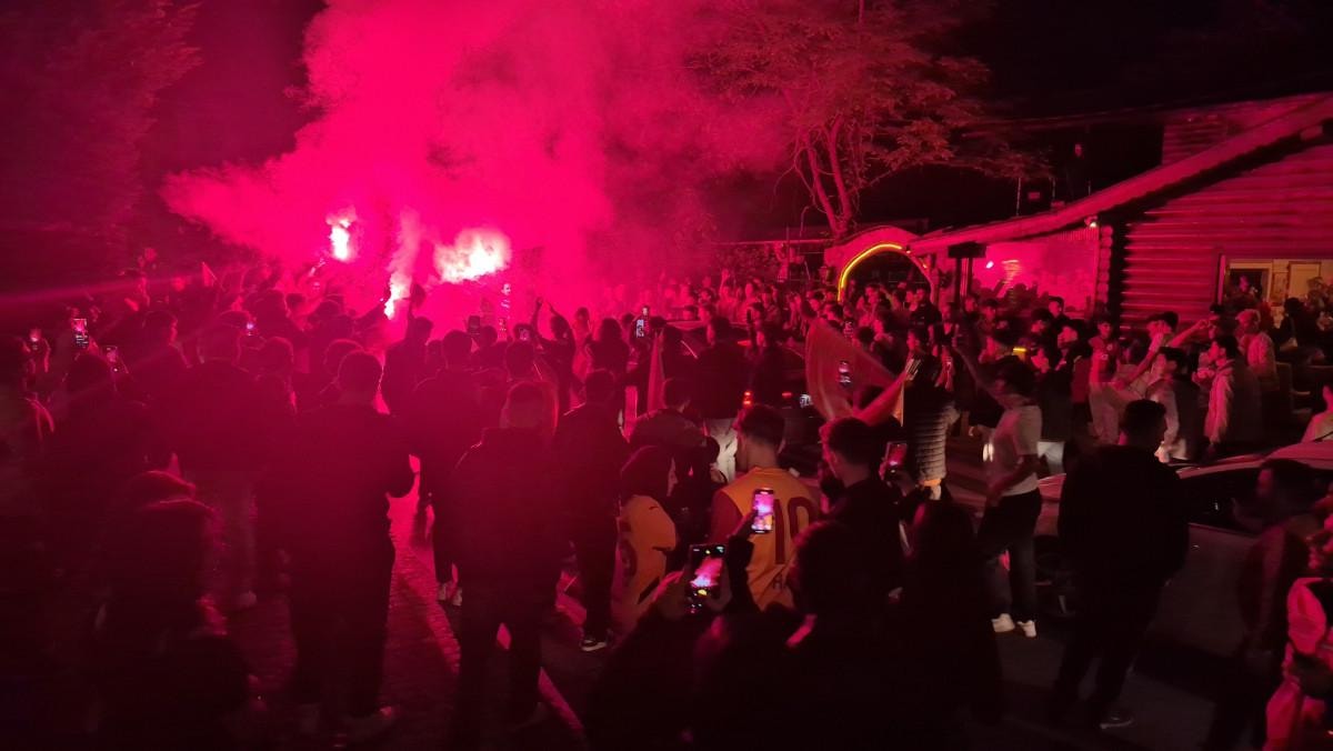 Ellerindeki meşaleler ve Galatasaray bayraklarıyla marşlar söyleyen taraftarlar, meydanı bayram havasına çevirerek 25. şampiyonluğu coşkuyla kutladı.