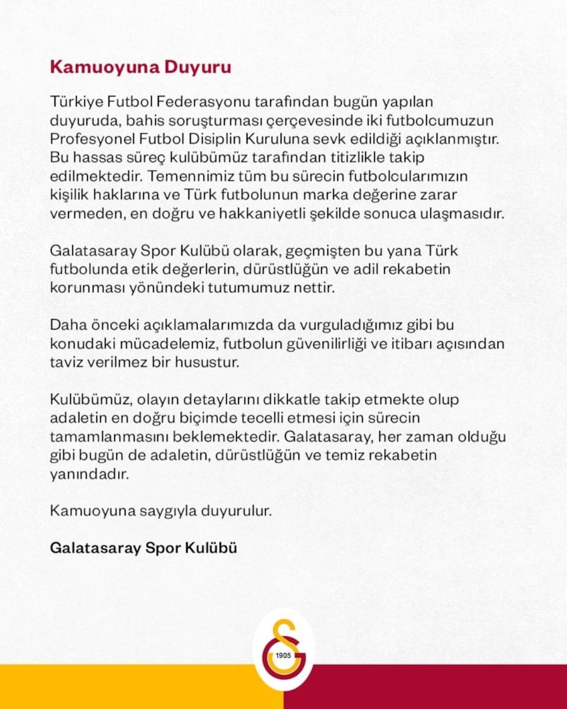 Galatasaray, futbolcuları Metehan Baltacı ve Eren Elmalı'nın bahis soruşturmasında yer almasıyla ilgili açıklamada bulundu.