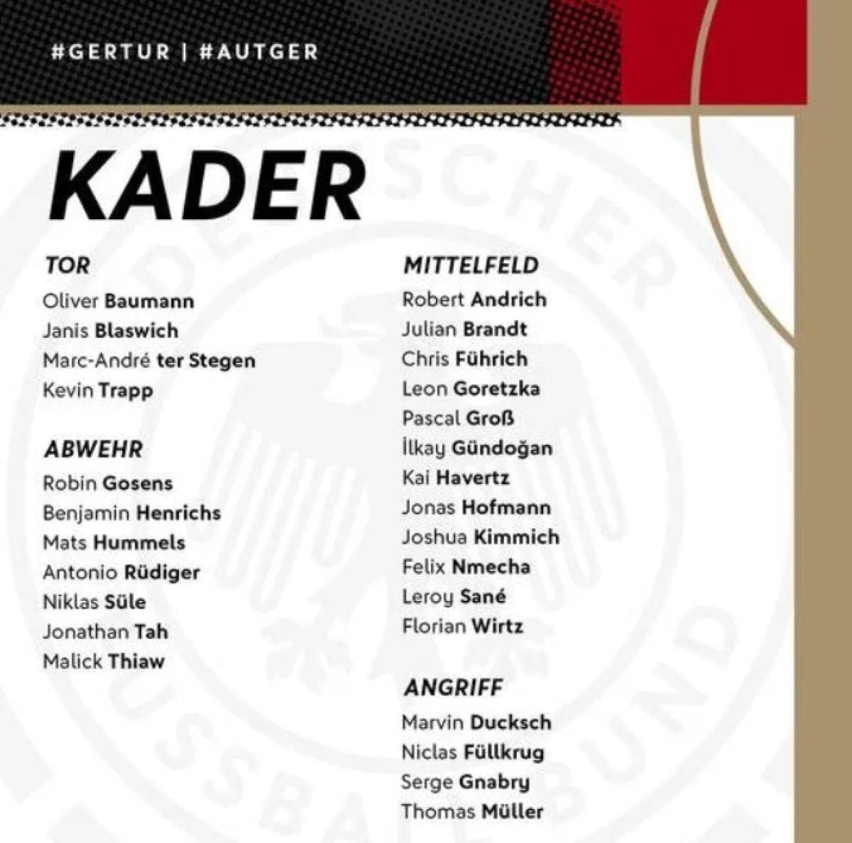 18 Kasım Cumartesi gecesi 22.45'te Berlin Olimpiyat Stadyumu'nda yapılacak müsabaka öncesinde Almanya, aday kadrosunu duyurdu.