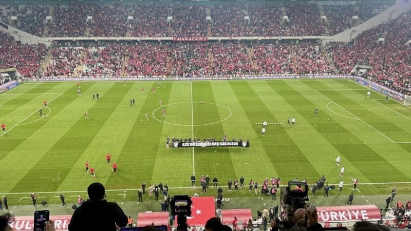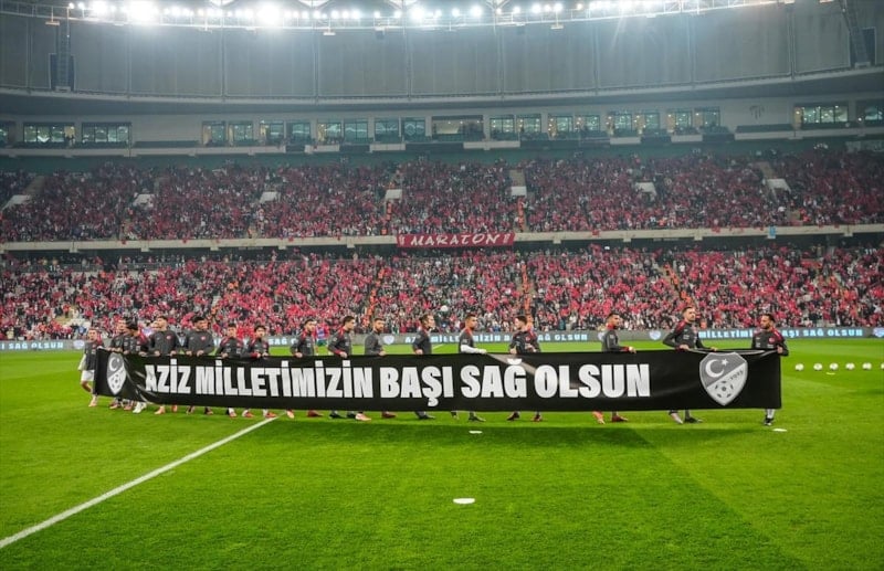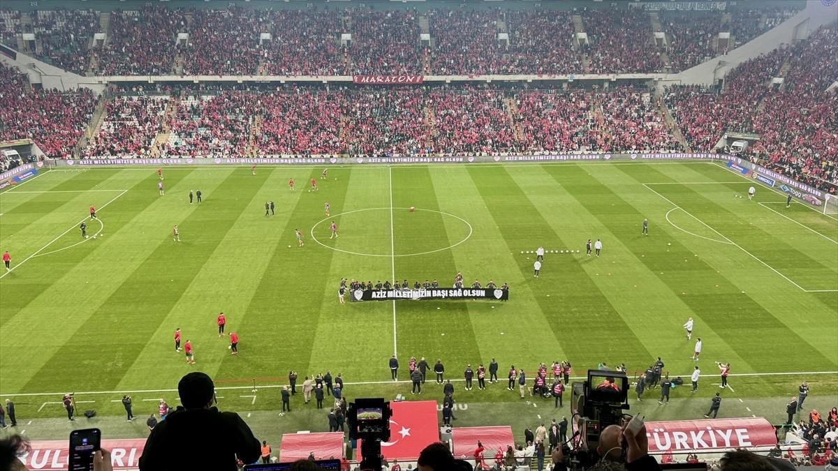 Milli futbolcular da ısınmada sahaya "Aziz Milletimizin Başı Sağ Olsun" yazılı pankartla çıktı.