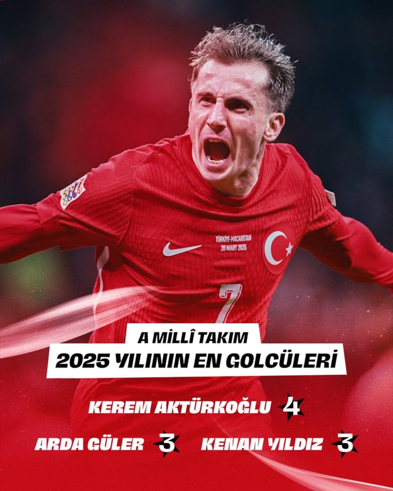 2025 yılında milli takımda atılan 25 golde, 13 farklı futbolcu gol sevinci yaşarken, hücumda en etkili isim Kerem Aktürkoğlu oldu ve rakip fileleri 4 kez havalandırdı.