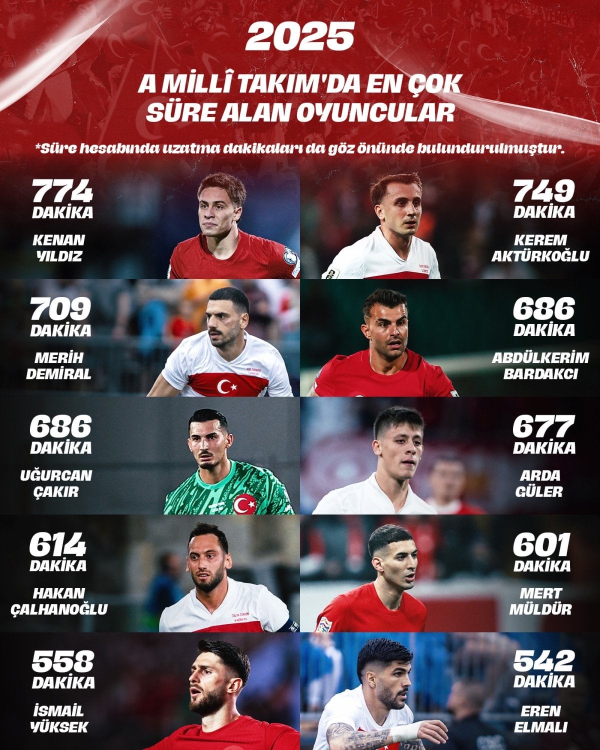 - A Milli Futbol Takımı'nda 2025 yılında en fazla süre alan oyuncu, Juventus'tan Kenan Yıldız oldu.