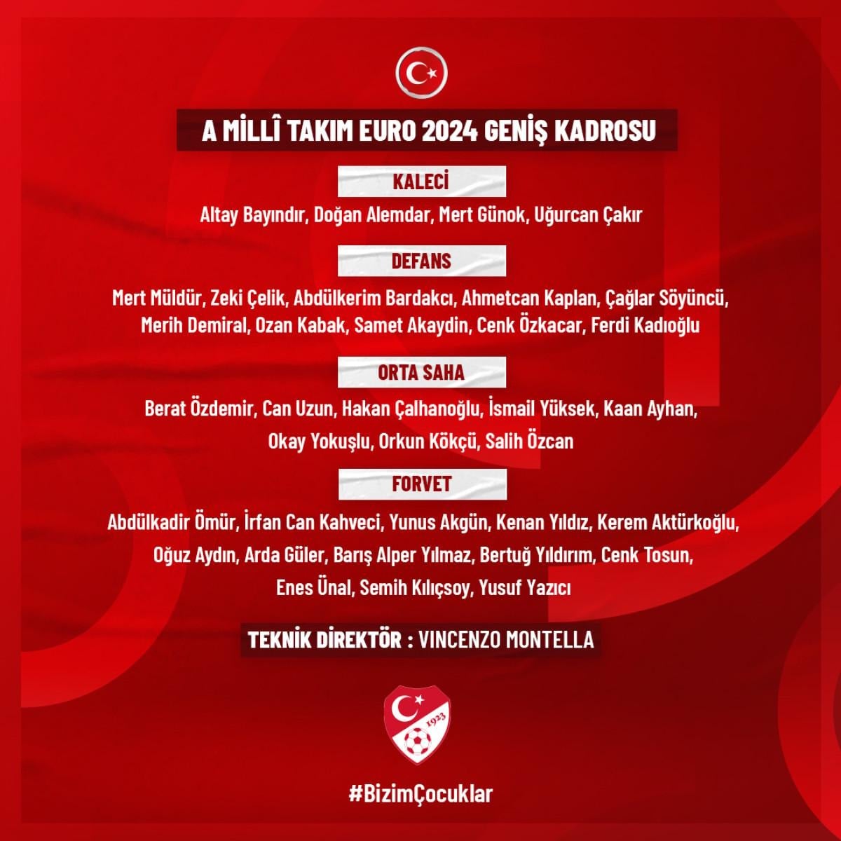 14 Haziran-14 Temmuz tarihleri arasında Almanya'nın ev sahipliğinde yapılacak Avrupa Futbol Şampiyonası'nda F Grubu'nda Portekiz, Çekya ve Gürcistan ile mücadele edecek A Milli Futbol Takımımızın geniş kadrosu duyuruldu.